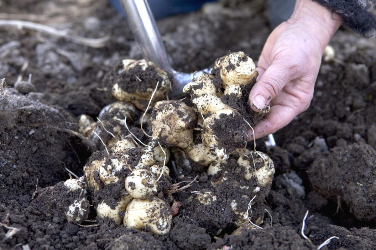 In principe kun je het hele jaar de knollen van de aardpeer, maar het beste moment hiervoor is februari of maart. Spit de grond even om voordat je de knollen poot. Ze kunnen heel goed tegen kou en ze zullen vanzelf uitlopen zodra het warm genoeg is.