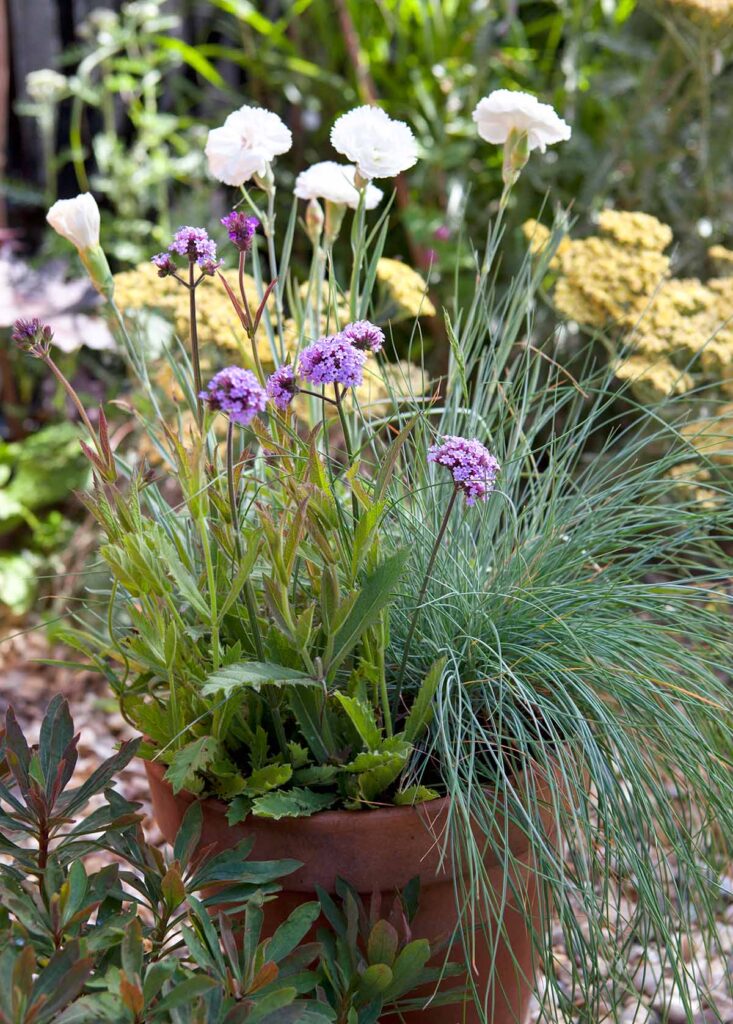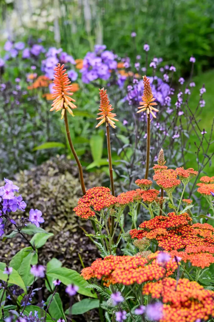 Probeer paarse bloemen te combineren met de geelgroene tinten van de vrouwenmantel (Alchemilla mollis) of euphorbia’s zoals Euphorbia amygdaloides var. robbiae. Dit geeft een mooi en contrasterend effect aan potten. De oranje vuurpijl (Kniphofia) en grote klaprozen (Papaver rhoeas) zouden hier ook goed bij passen.